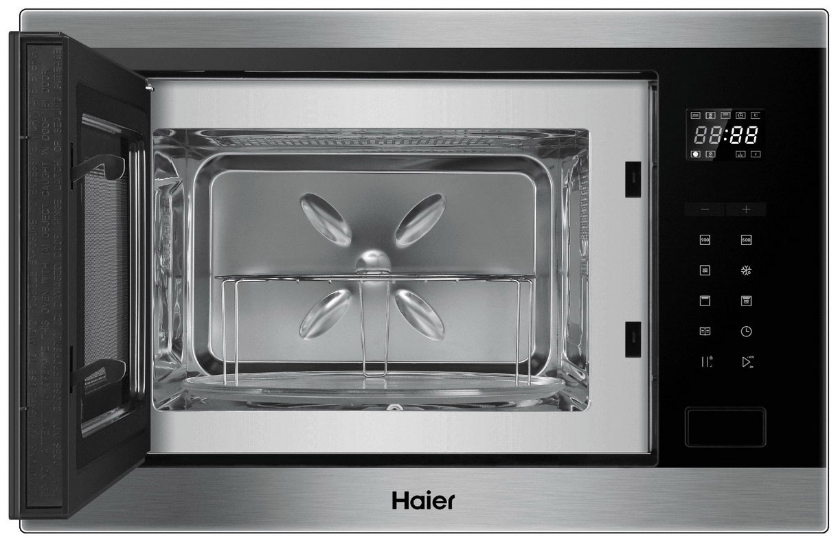 Встраиваемая микроволновая печь Haier HMX-BTG259X оснащена черной передней панелью с дисплеем и сенсорными кнопками. Вы можете использовать 8 автоматических программ, включая возможности разморозки и разогрева. Безопасной эксплуатации способствует система блокировки от детей.